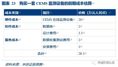 根據環保在線網站的統計,國內大部分公司對cems監測系統的公開報價均在10-20萬人民幣之間,使用壽命為10年。不包括服務費。考慮到大部分監測系統目前只能監測so2、nox、顆粒物,并未安裝具有二氧化碳監測功能的部件,我們將20萬元作為具備監測二氧化碳功能的cems監測系統的平均價格。軟件成本和服務成本我們參考了美國市場的價格,并基于此對公司持有一套cems在線監測系統的現金流進行了測算: