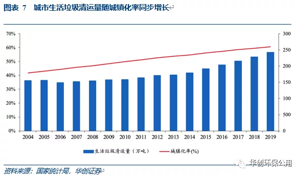 截至2019年,我國城鎮化率已達60.6%,提前完成“十三五”規劃提出的到2020年實現城鎮化率達到60%的目標,預計到2025年,中國城鎮化率有望達到66.5%。城鎮化率提升推動居民生活水平的提高,進而消費水平提升將從源頭帶來穩步增長的垃圾清運量。2019年我國城鎮垃圾清運量達到2.4億噸,同比增加6.16%,假設2020-2025年年均增速6.5%,預計到2025年城鎮生活垃圾清運量有望達3.53億噸。