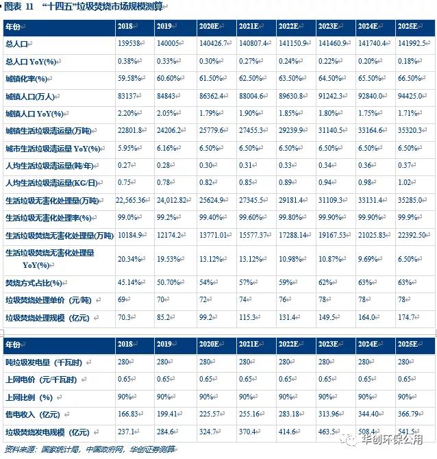 根據我們的假設,可推算到2022年,生活垃圾無害化處理量可達1.7億噸,2025年可達2.2億噸,以2020年中標項目均價72元/噸和處理單價0.65元/度的上網電價計算,2025年垃圾焚燒處理規模將達541億元,市場空間仍大。