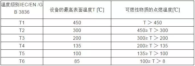 這是與氣體點(diǎn)燃溫度有關(guān)的電氣設(shè)備(假定環(huán)境溫度為40℃時(shí))的最高表面溫度,點(diǎn)燃能量與點(diǎn)燃溫度無(wú)關(guān)。